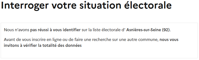 Si vous n’êtes pas inscrit sur la commune renseignée, vous aurez le message d’erreur suivant (ici en essayant de chercher un électeur inscrit sur Courbevoie à Asnières-sur-Seine) :