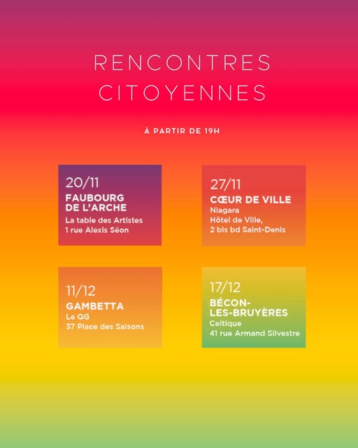 Nos rencontres citoyennes pour les élections municipales 2026 à Courbevoie sont désormais programmées ! Ces moments d’échange sont l’occasion pour vous de dialoguer directement avec les membres de notre collectif sur les projets pour Courbevoie et les initiatives locales dans votre quartier.